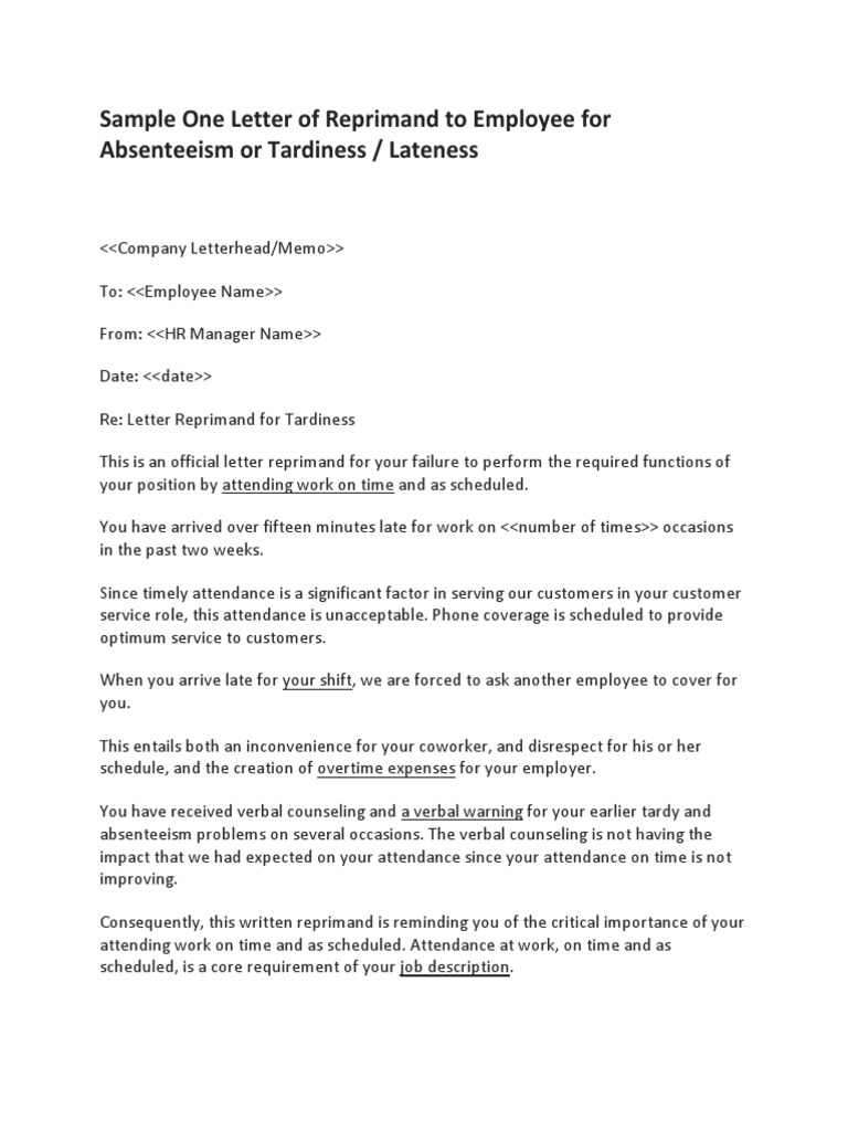 Sample One Letter Of Reprimand To Employee For Absenteeism Or Tardiness Lateness Employment Business